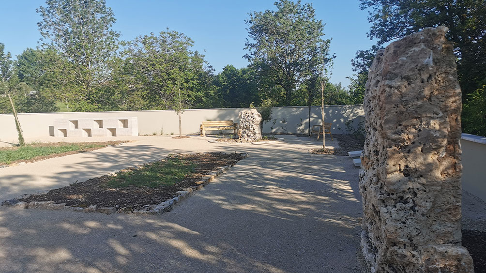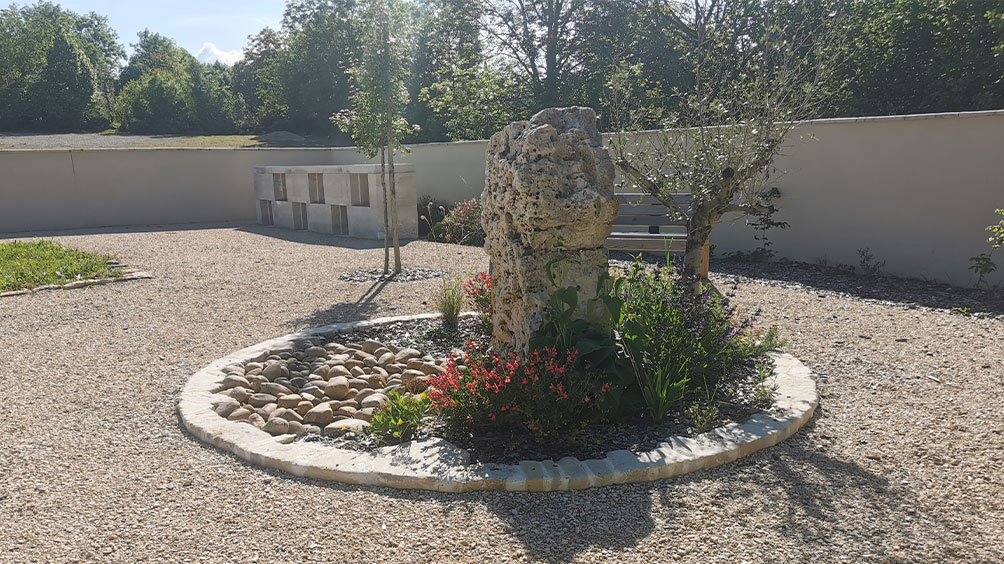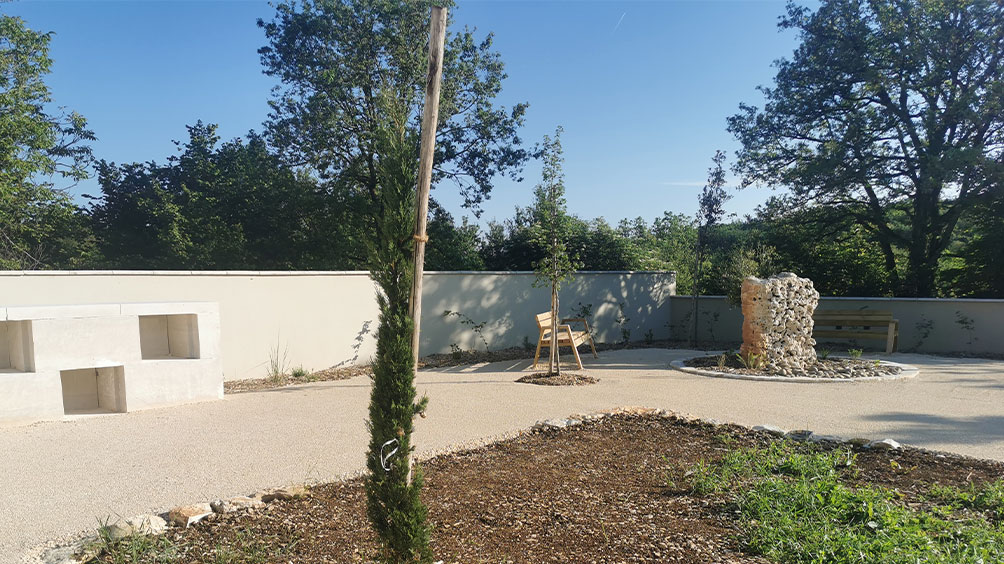 L’aménagement paysager est conçu comme un « jardin rural » qui se développe à l’entrée et dans l’enceinte du cimetière ou peuvent se dérouler les cérémonies mais également ou les habitants peuvent venir se promener, se reposer ou se réunir.
