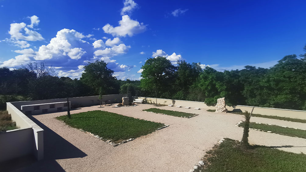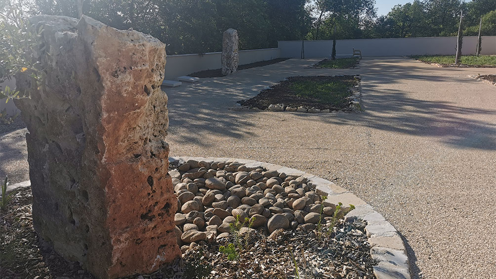 L’usage de « pierres trouées » posées verticalement sont issus de carrières artisanales de proximité et agissent comme des marquer identitaire du paysage très local. L’entrelacement des vides et des pleins peuvent apparaitre comme des métaphores du lien entre la vie et la mort.