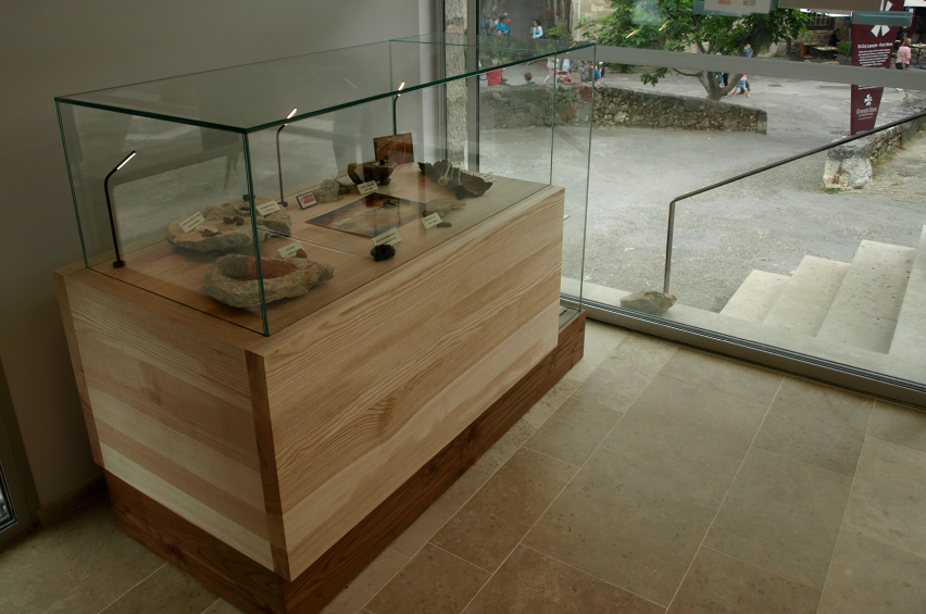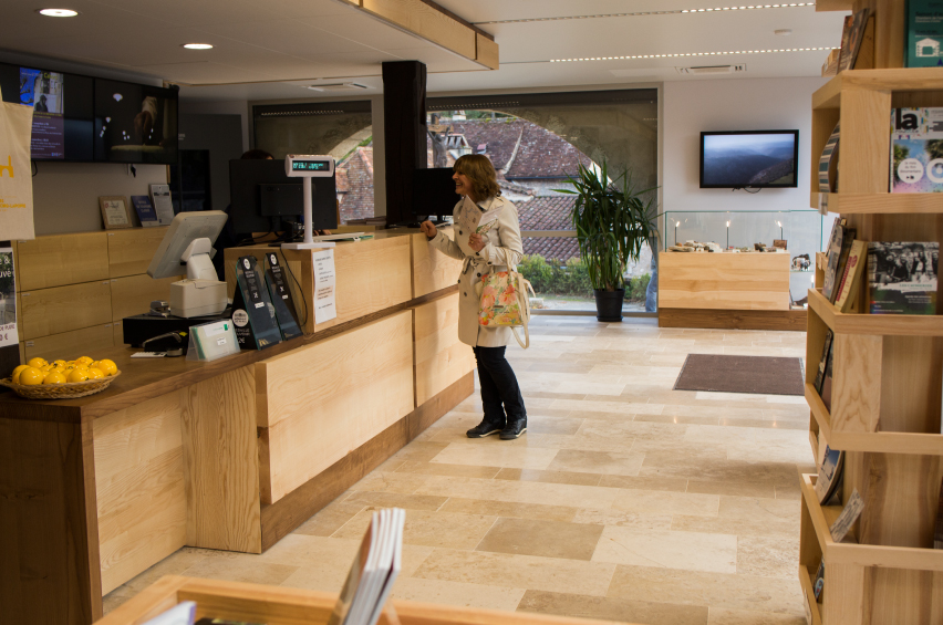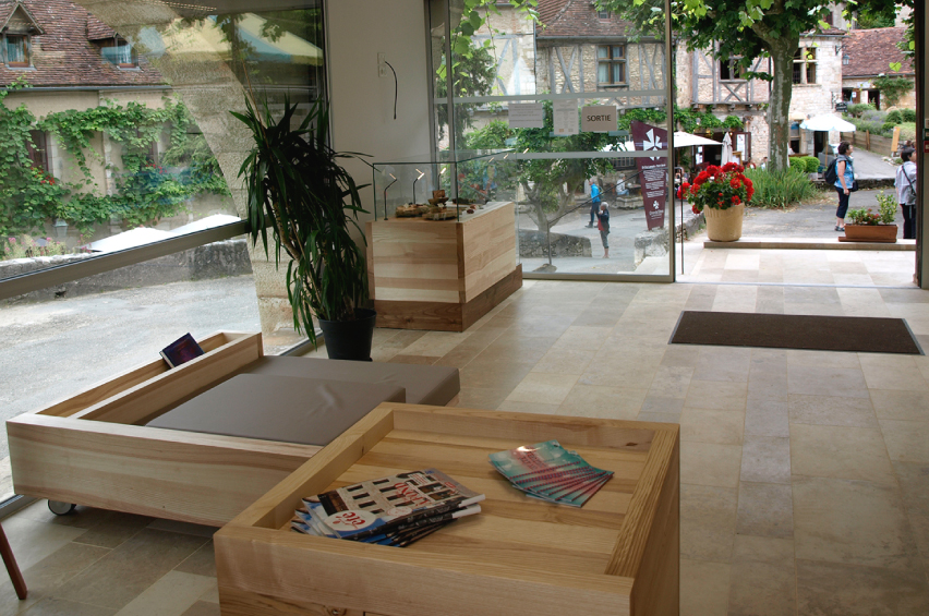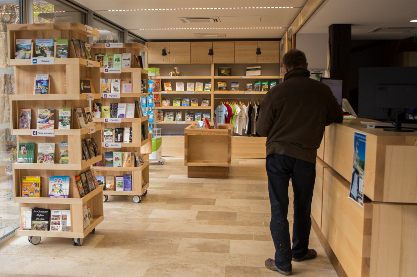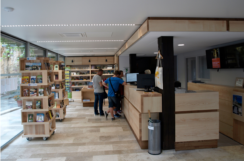 Notre choix d’utiliser le bois massif pour les agencements de l’accueil, la boutique et les mobiliers divers, nous permet de travailler avec une filière de production courte et de proximité. Par ce postulat nous voulions faire rentrer dans l’office du tourisme le paysage, par l’usage des arbres et des pierres du territoire, et les savoir-faire locaux par le travail des entreprises et artisans de proximité.